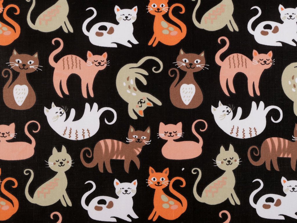 Bavlněnou látku zdobí potisk barevných koček. Využijete ji na šití polštářů, povlečení, závěsů, pytlíků, tašek a dalších doplňků.Doplňkové parametry