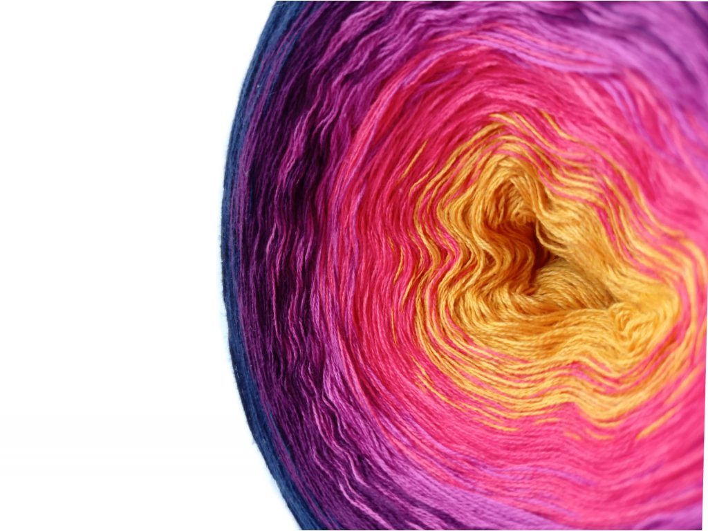 Luxusní, ručně vyrobené duhové klubíčko s jemnými přechody, ze kterého vzniknou lehké a vzdušné modely bez zbytečného sešívání. Délka 1500 m znamená jedno klubko pro velký šátek, šaty, sukni nebo třeba deku do kočárku.