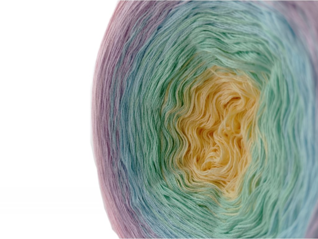 Luxusní, ručně vyrobené duhové klubíčko s jemnými přechody, ze kterého vzniknou lehké a vzdušné modely bez zbytečného sešívání. Délka 1500 m znamená jedno klubko pro velký šátek, šaty, sukni nebo třeba deku do kočárku.