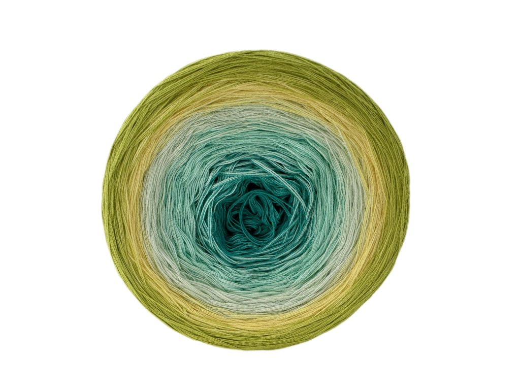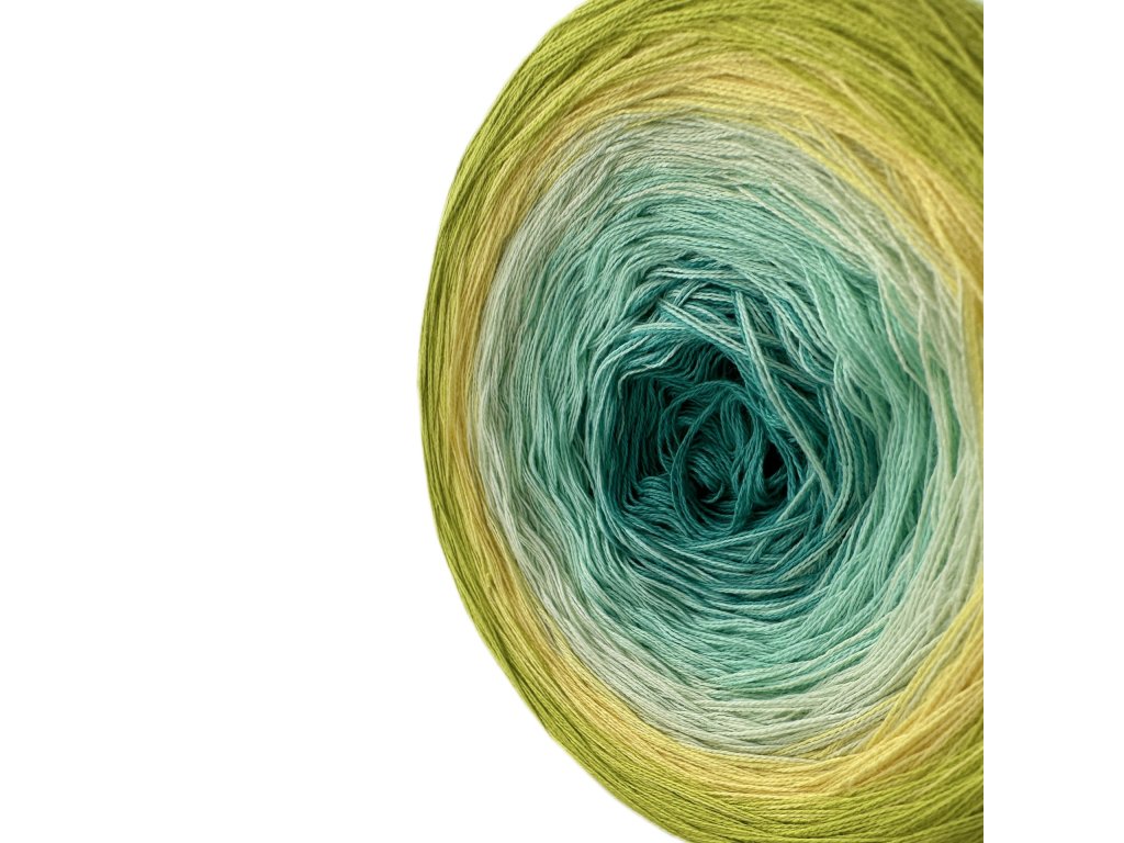 Luxusní, ručně vyrobené duhové klubíčko s jemnými přechody, ze kterého vzniknou lehké a vzdušné modely bez zbytečného sešívání. Délka 1500 m znamená jedno klubko pro velký šátek, šaty, sukni nebo třeba deku do kočárku.