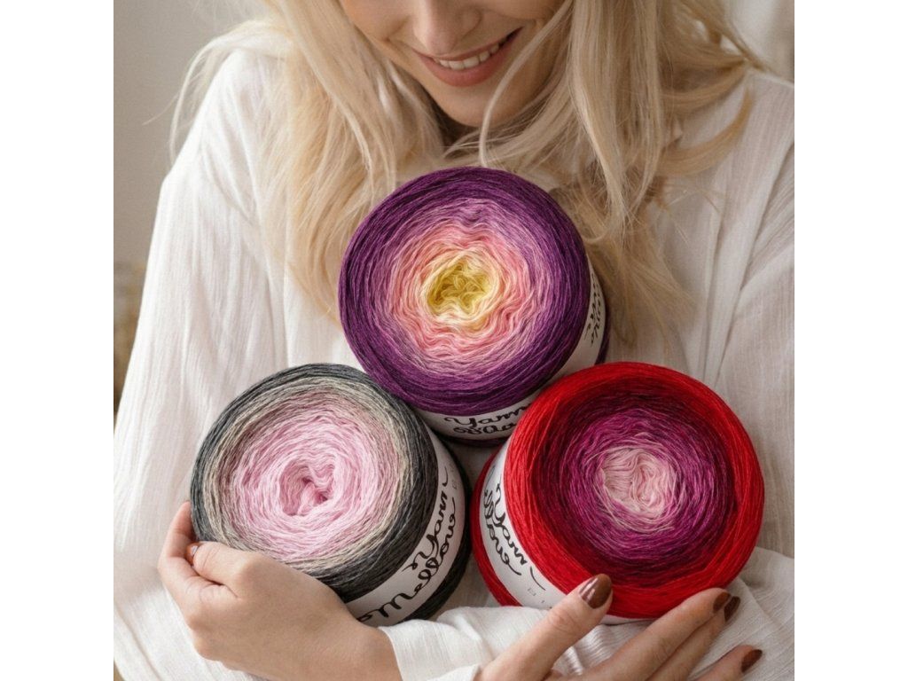 Luxusní, ručně vyrobené duhové klubíčko s jemnými přechody, ze kterého vzniknou lehké a vzdušné modely bez zbytečného sešívání. Délka 1500 m znamená jedno klubko pro velký šátek, šaty, sukni nebo třeba deku do kočárku.