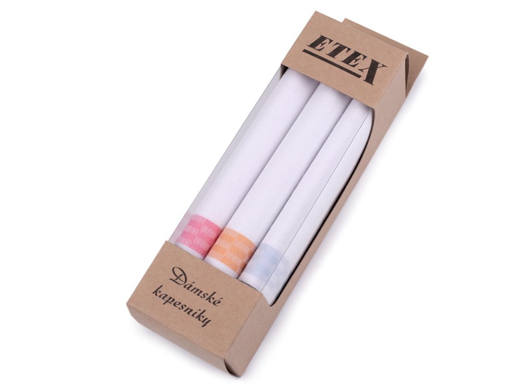 Sada dámských kapesníků kvalitní české výroby, je zabalená v papírové krabičce s průhledem. Krabičku můžete zavěsit na prodejní stojan. V jedné krabičce jsou 3 kapesníky, které mají čtvercový tvar o rozměru 29 x 29 cm. Kapesníky jsou univerzálním a praktickým dárkem, který určitě potěší každou ženu.Mix náhodných variant obsahuje druhy kapesníků, které máme právě skladem, fotografie je pouze ilustrační, skladba kapesníků se může mírně lišit.