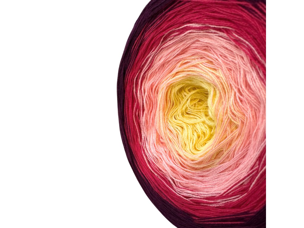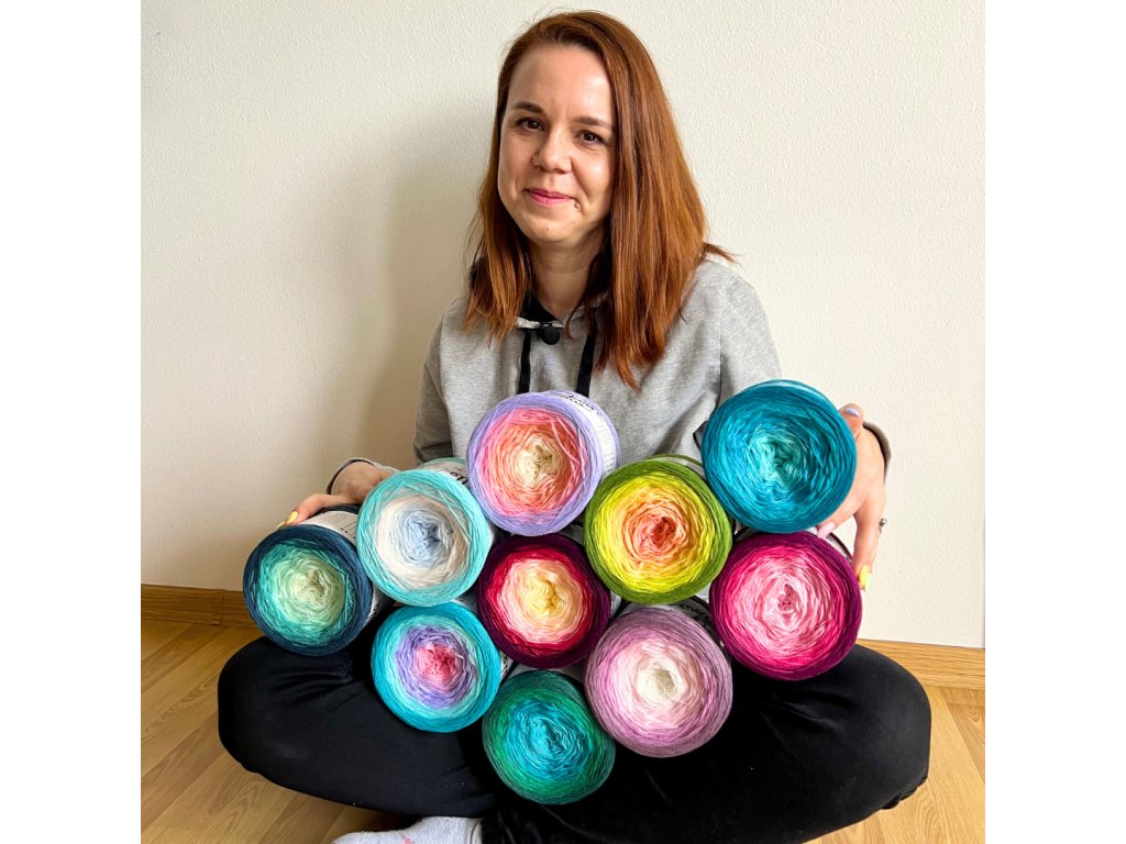 Luxusní, ručně vyrobené duhové klubíčko s jemnými přechody, ze kterého vzniknou lehké a vzdušné modely bez zbytečného sešívání. Délka 1500 m znamená jedno klubko pro velký šátek, šaty, sukni nebo třeba deku do kočárku.