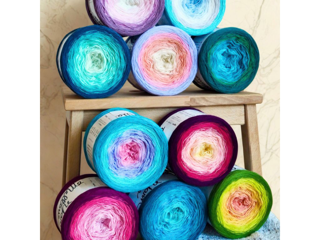 Luxusní, ručně vyrobené duhové klubíčko s jemnými přechody, ze kterého vzniknou lehké a vzdušné modely bez zbytečného sešívání. Délka 500 m znamená jedno klubko pro šálu, tílko, nebo sukni pro menší holky.
