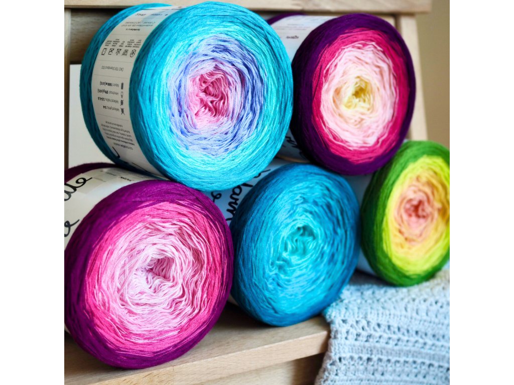 Luxusní, ručně vyrobené duhové klubíčko s jemnými přechody, ze kterého vzniknou lehké a vzdušné modely bez zbytečného sešívání. Délka 500 m znamená jedno klubko pro šálu, tílko, nebo sukni pro menší holky.
