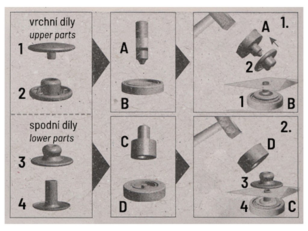 Knoflíky stiskací Wuk Ø15 mm na středně silné látky, s ručním kovovým aplikátorem