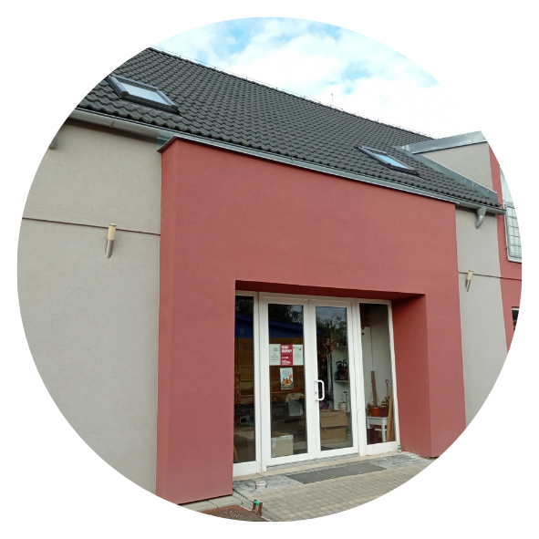 Náš sklad je na konci ulice v šedo-červeném domečku.