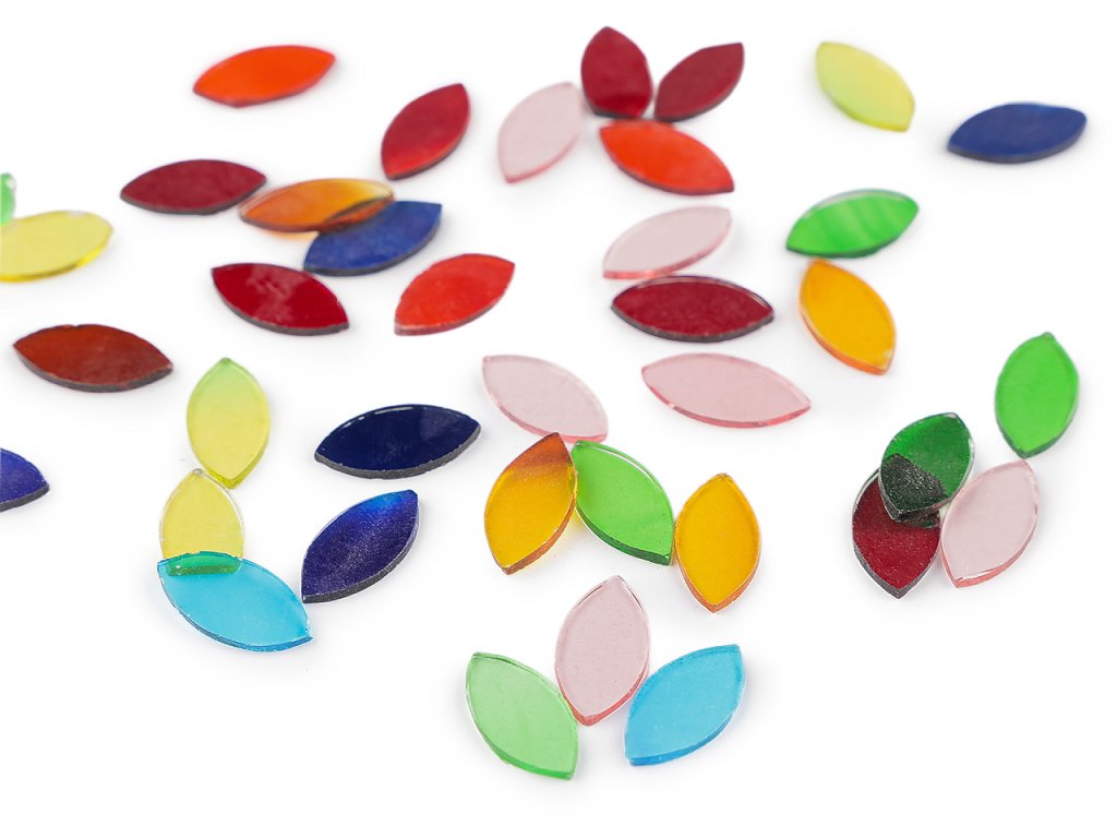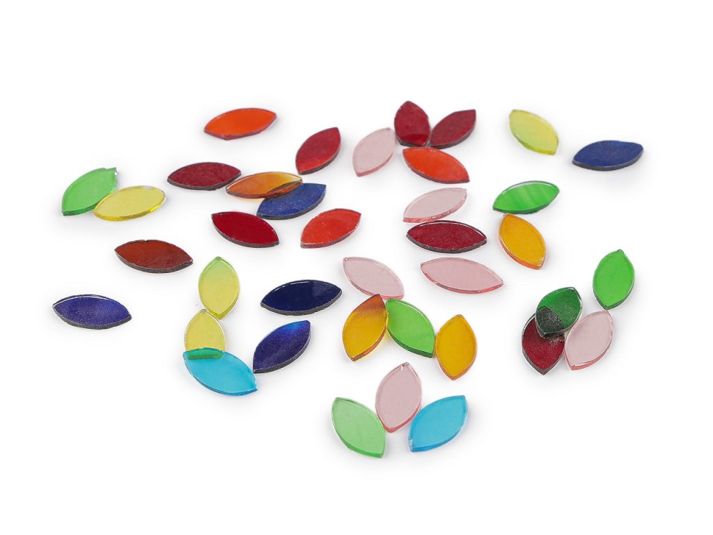 Barevný mix skleněných kamínků ve tvaru listu využijete na výrobu mozaiky. Dají se skládat do zajímavých obrazců. Jsou transparentní, hodí se k nalepení na materiály jako je plast, dřevo, kámen, kov, keramika a jiné. Mozaikou můžete ozdobit kartónové a dřevěné krabičky, květináče, šperkové polotovary, skleněné vázy, svícny, lahve, amfóry, kameny apod.Použití: objekt, na který budete mozaiku vytvářet, i kamínky musí být suché a čisté, bez prachu a mastnoty. Na připevnění mozaiky můžete použít beton, lepidlo nebo oboustrannou lepicí pásku. Lepidla stačí nanést trošku na kamínek a ten přilepit na vybrané místo. Lepidlo nechejte 24 hodin zaschnout. Poté můžete použít spárovací hmotu a výsledné dílo tak dotáhnout k dokonalosti, ale její použití není nutné.