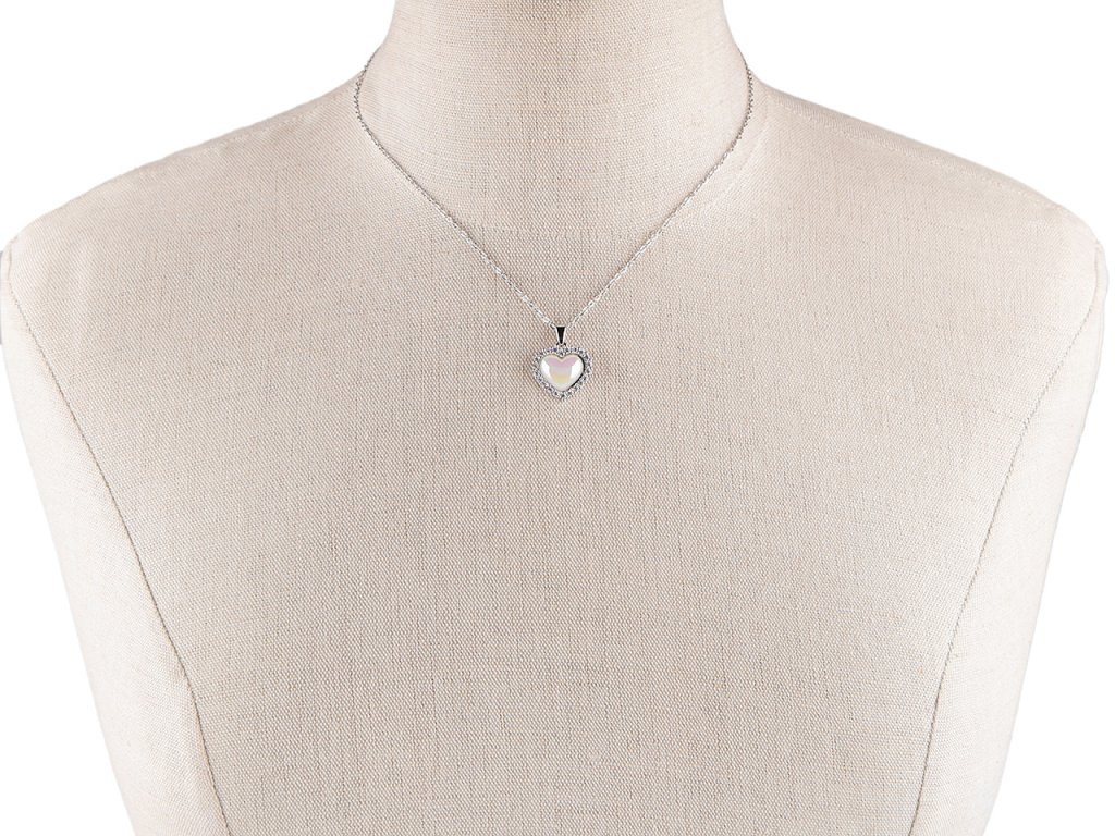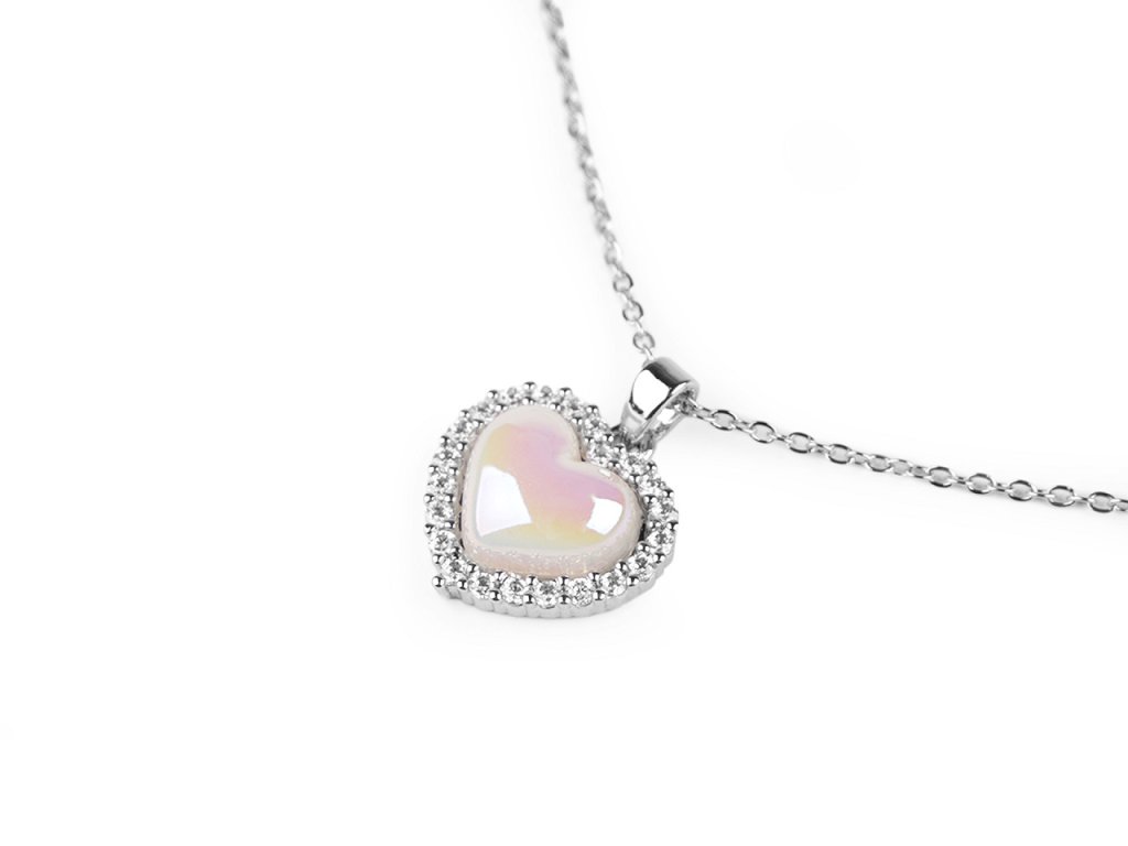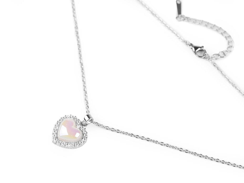 Řetízkový náhrdelník s přívěskem srdce je vyrobený z kvalitní nerezové oceli. Srdce má nádherný perleťový lesk, dokola je osázené třpytivými broušenými kamínky. Je zavěšené na šlupně, volně se na řetízku pohybuje. Náhrdelník decentně dozdobí většinu outfitů. Bude nádherným dárkem pro blízkou osobu nebo na Valentýna.Zapíná se na karabinku s prodlužovacím řetízkem.