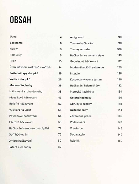 Kniha je opravdu od A do Z, tedy sestavená postupně od úplných základů jako je správný výběr háčku a příze, přes základní sloupky až po moderní metody jako je třeba Ombré háčkování nebo Intarzie.