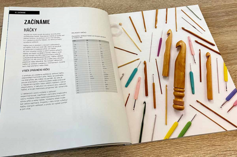 V první části knihy najdete podrobné informace o tom, jak zvolit vhodný háček (nechybí ani šikovná tabulka velikosti háčků pro různé země) a pomůcky, jaké máme druhy příze a nechybí ani tabulka zkratek a značek včetně popisu, jak číst schéma.