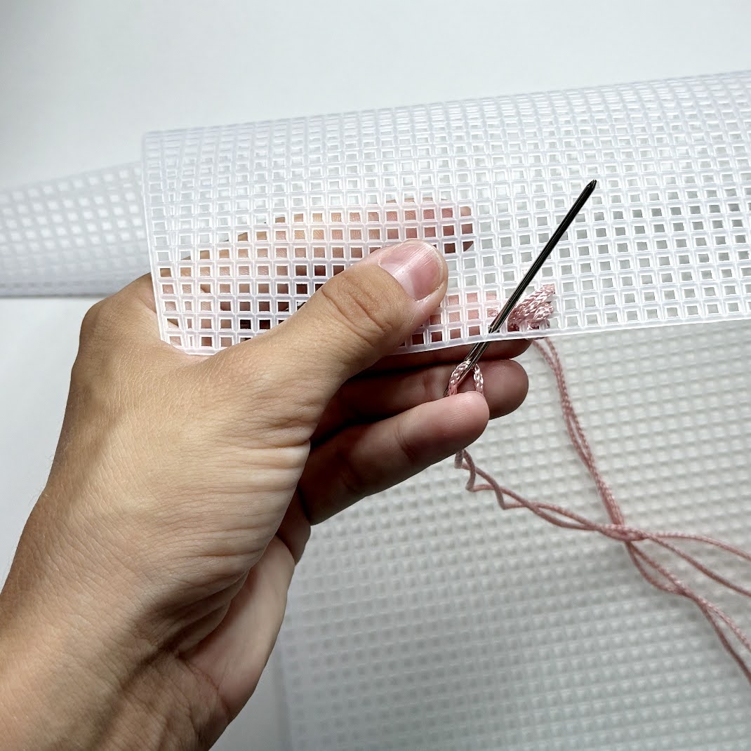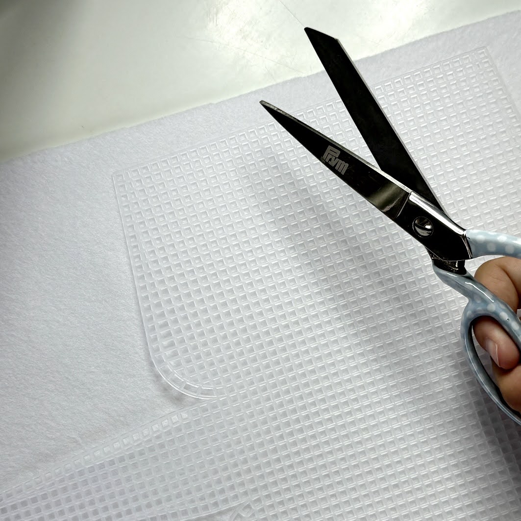 2 klubíčka příze Polyester macramé od Juskuv, plastovou kanavu 35x33 cm, látku o vel. 35x35cm, 2 kovové kroužky, řetízek nebo popruh, zapínání, fix, jehlu na přízi, nůžky, jehlu a nit nebo tavnou pistoli, kladívko a šroubovák na zapínání, zapalovač.