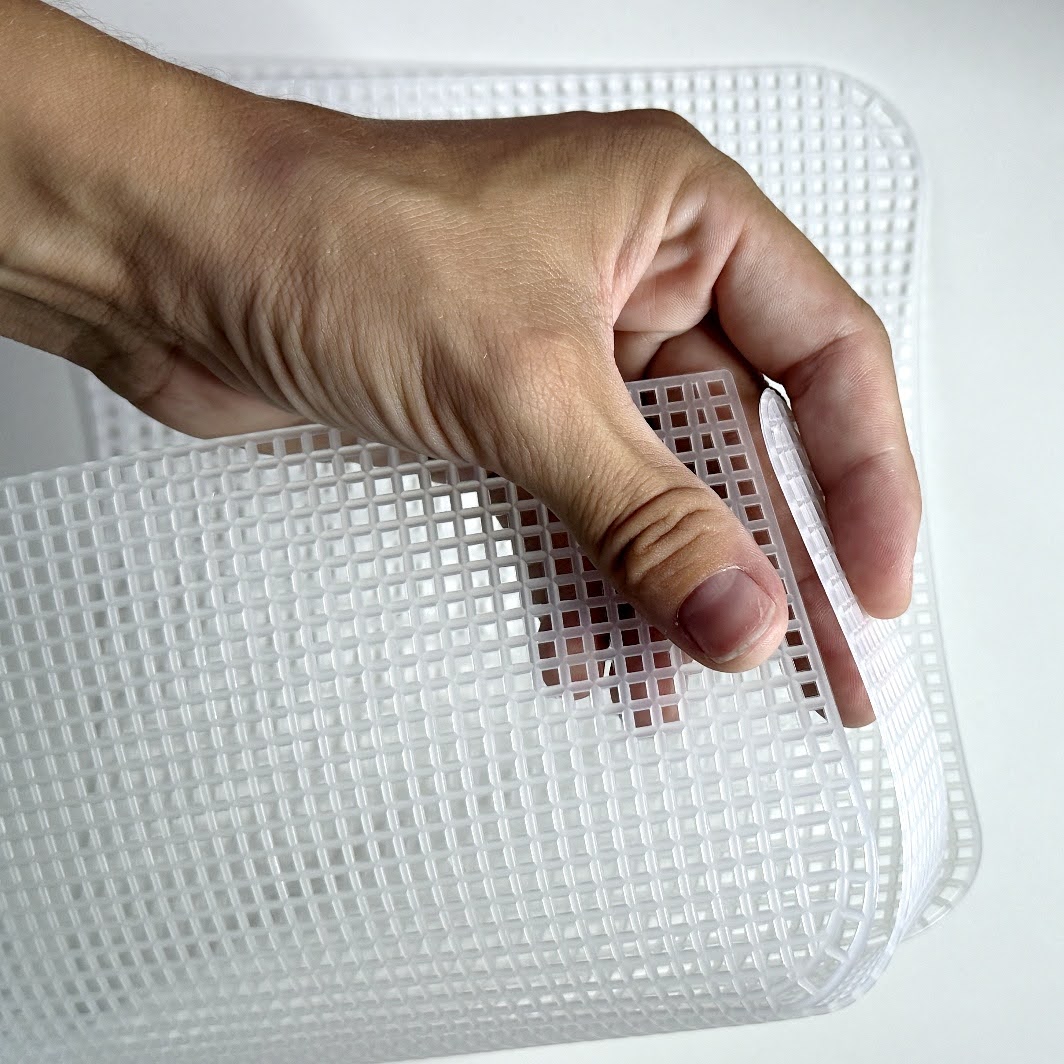 Vypleťte vzor po celé mřížce. Poté ji poskládejte do požadovaného tvaru a hrany sešijte. Nakonec obšijte kraje, aby byly co nejůhlednější.