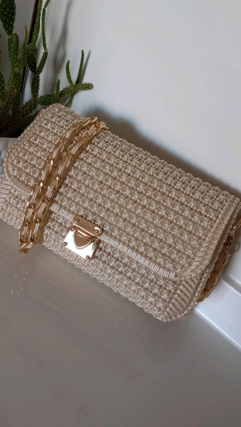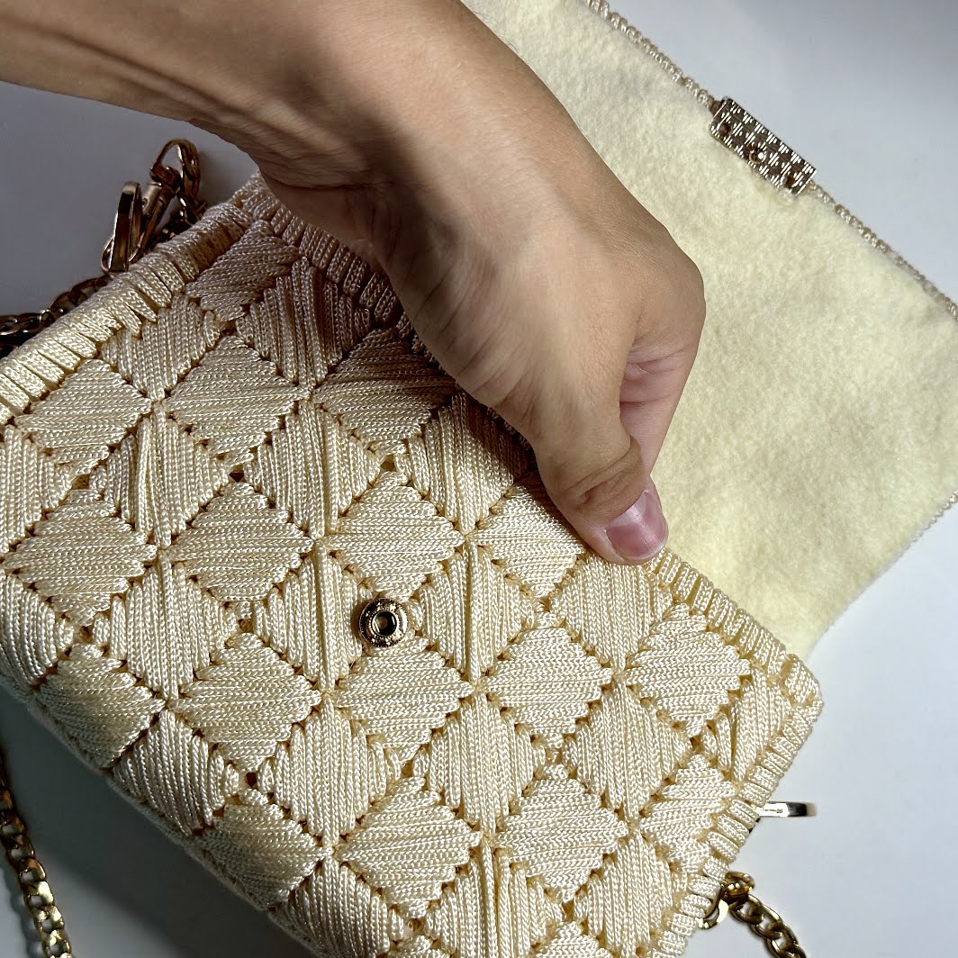 Přízi mějte navlečenou dvojitě. Na konci stačí udělat uzel, čtverečky neproleze. Protože budete muset přízi často navazovat, budete mít uvnitř kabelky hodně uzlíků. Z toho důvodu doporučujeme přidat podšívku ze silnější látky, např. z fleecu, uzlíky krásně schová.