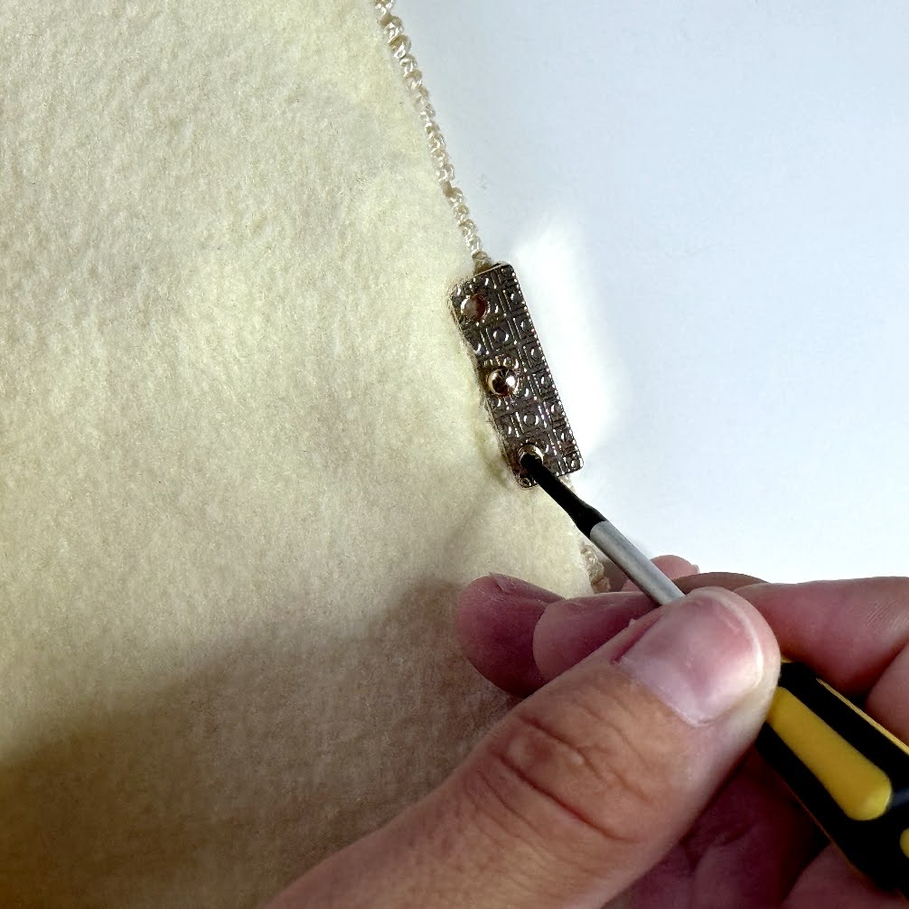 Pak připevněte ozdobnou část zapínání. Tady doporučujeme použít přiložené šroubky a klidně i trochu lepidla, aby opravdu pořádně drželo.
