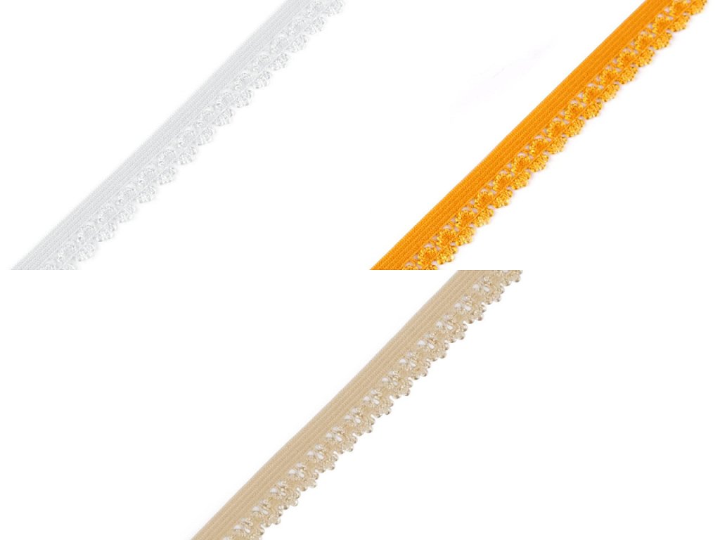 Ozdobná pruženka s krajkou je příjemná na dotek a jemná v tahu. Využijete ji k lemování spodního prádla, podvazků, halenek, šatů apod. Je vhodná také na výrobu ramínek ke košilkám, tílkům nebo podprsenkám.Krajka má šíři 8 mm.