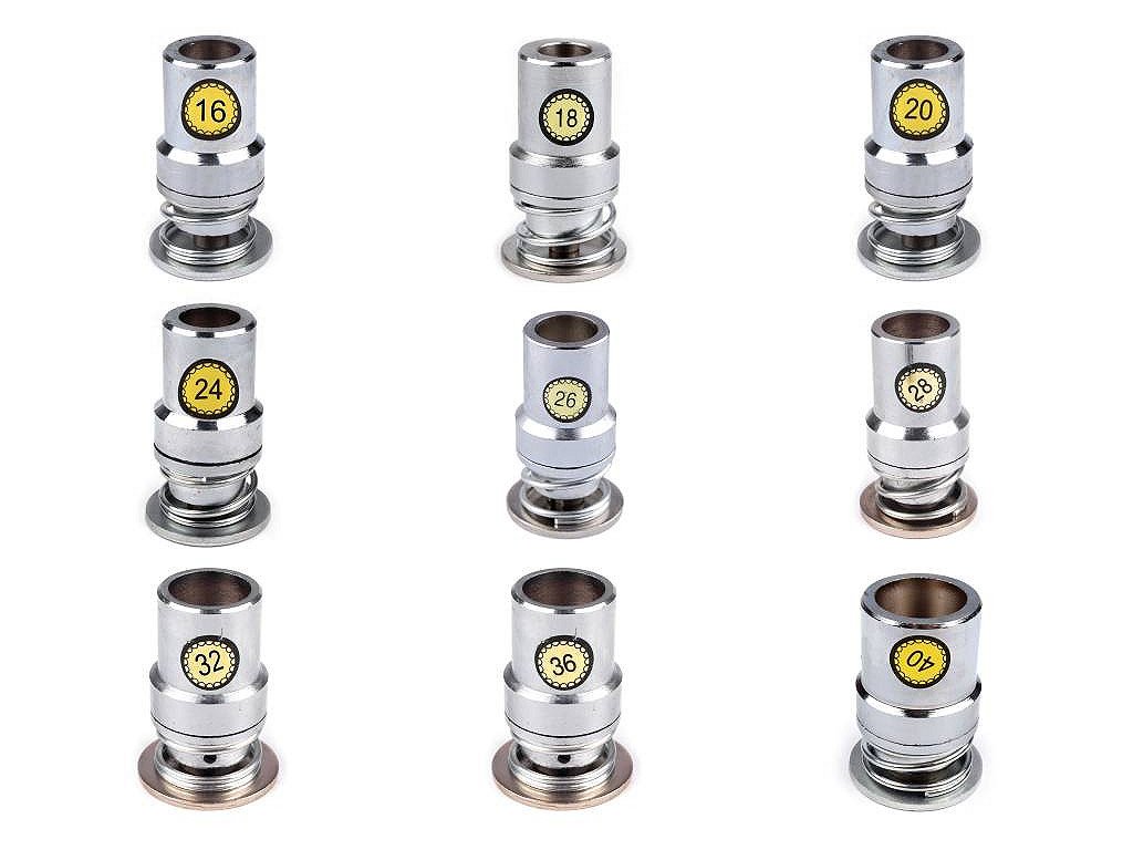 Piston na potahování knoflíků.Každý je označený číslem, které udává velikost knoflíku, která se do pistonu vkládá. Např. pistonem s číslem 20 potáhnete knoflíky velikosti 20.