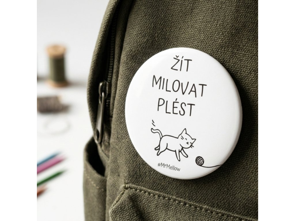 Placka se spínacím špendlíkem o průměru 4,5 cm s nápisem ,,Nevíš co je závislost, dokud jsi nevyzkoušel háčkování."