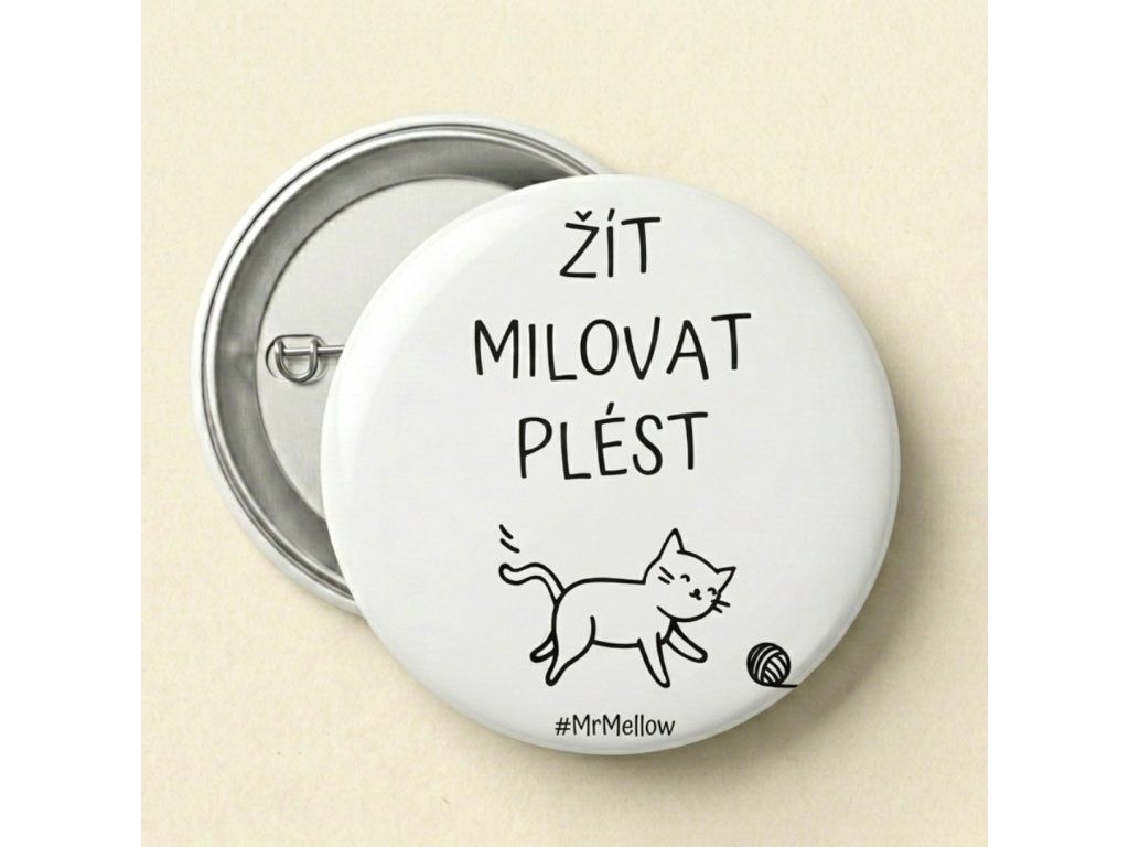 Placka se spínacím špendlíkem o průměru 4,5 cm s nápisem ,,Žít, milovat, plést."