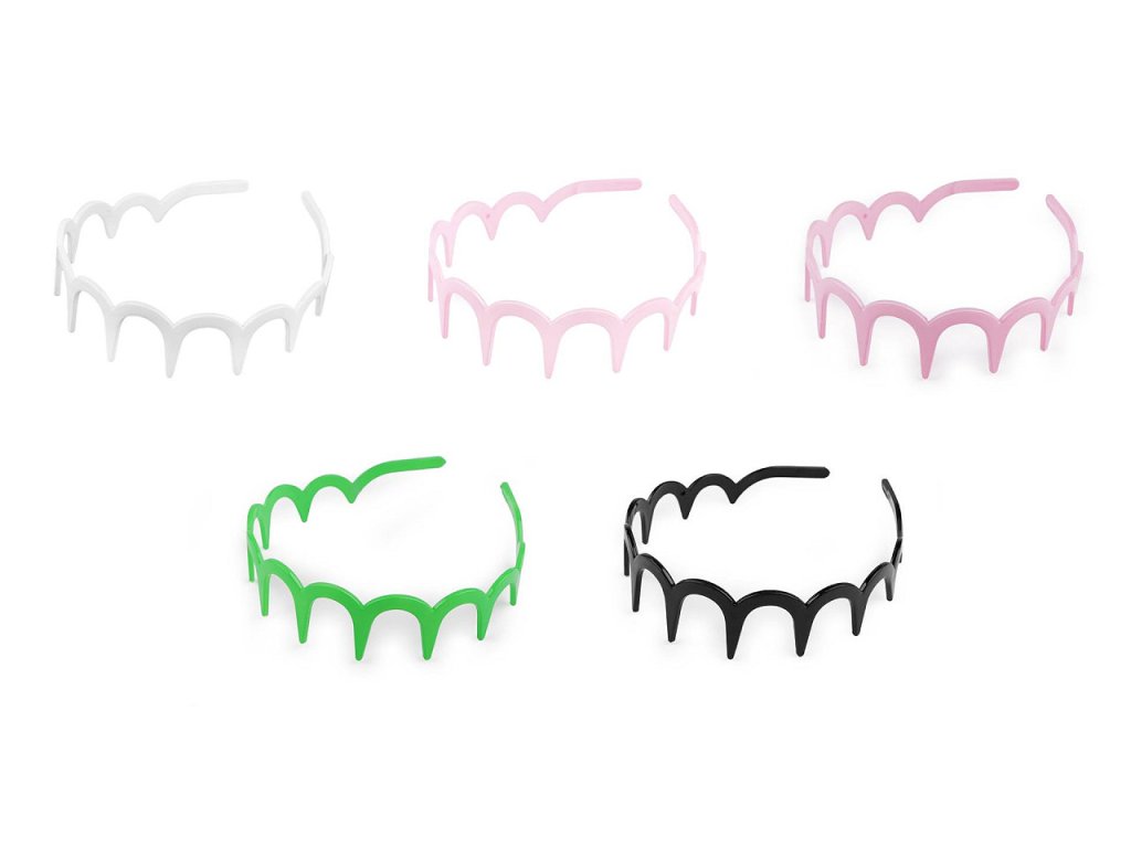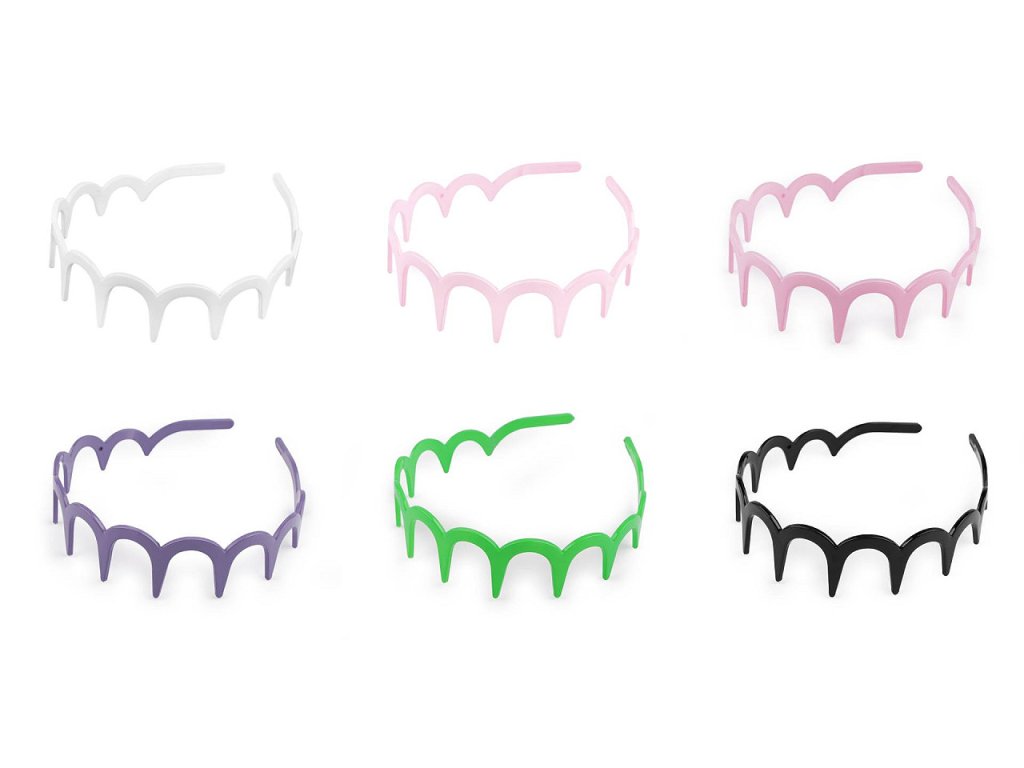 Plastová čelenka s obloučky a velkými zuby má lesklý a hladký povrch. Je vyrobená z kvalitního plastu, velmi dobře ve vlasech drží.Můžete ji využít jako základ k dalšímu dozdobení a vytvořit si tak jedinečný kousek přímo na míru pro vás. Ozdoby můžete nalepovat nejlépe lepidlem na textil nebo tavnou pistolí.