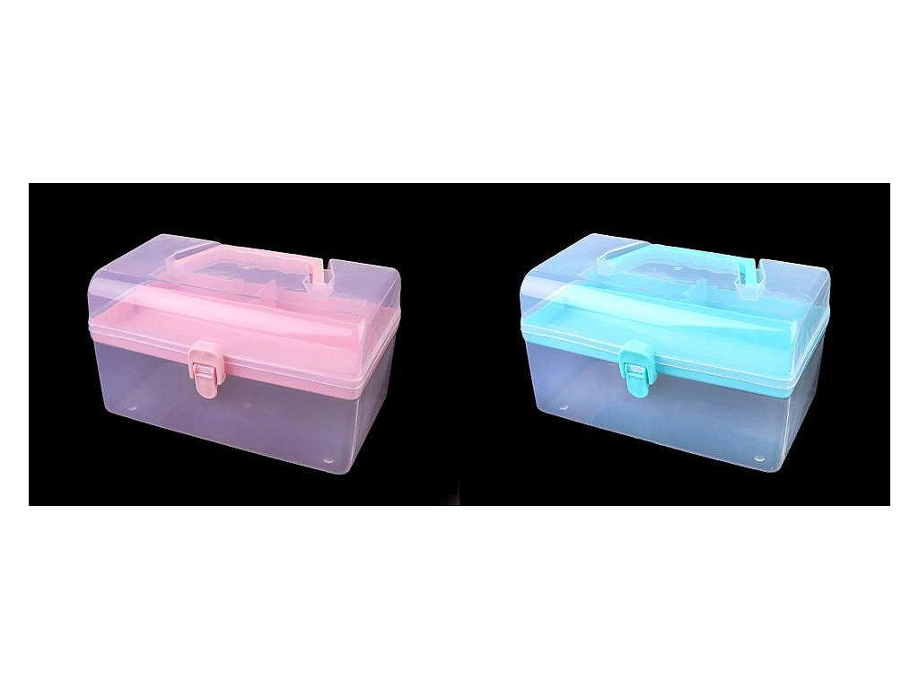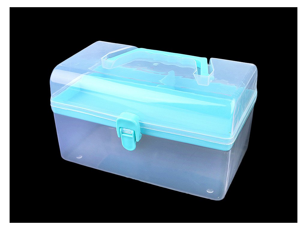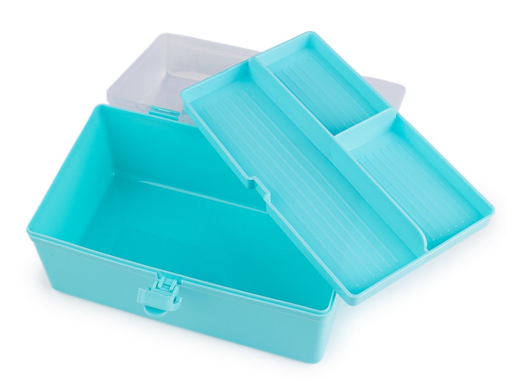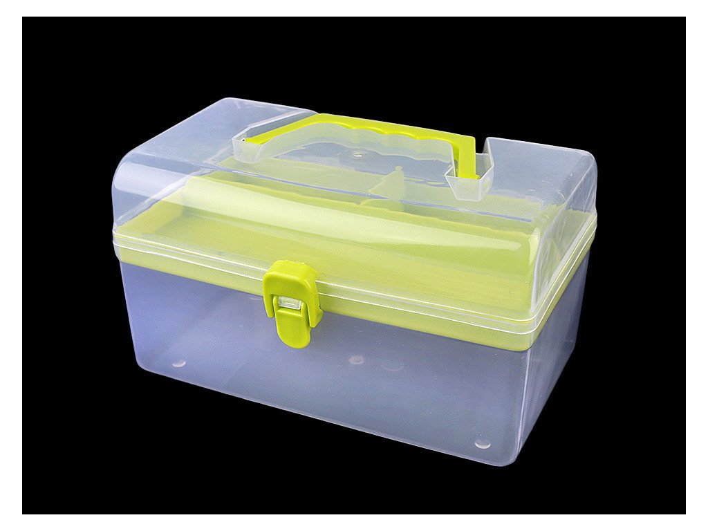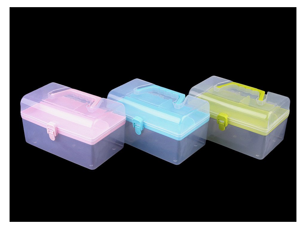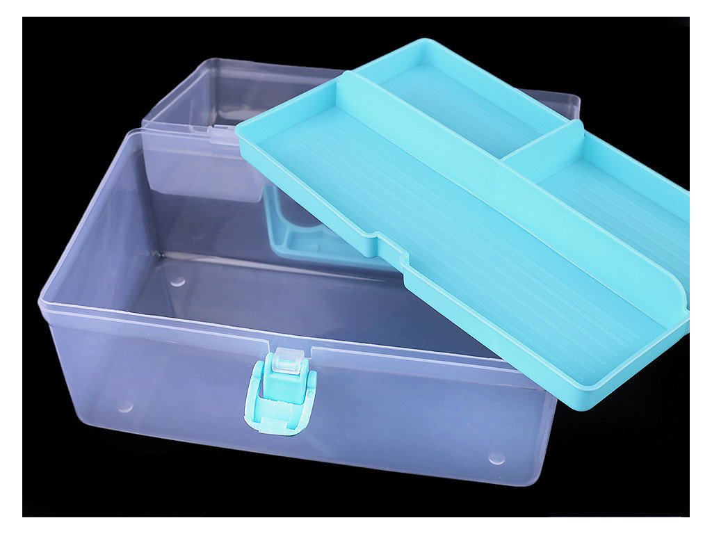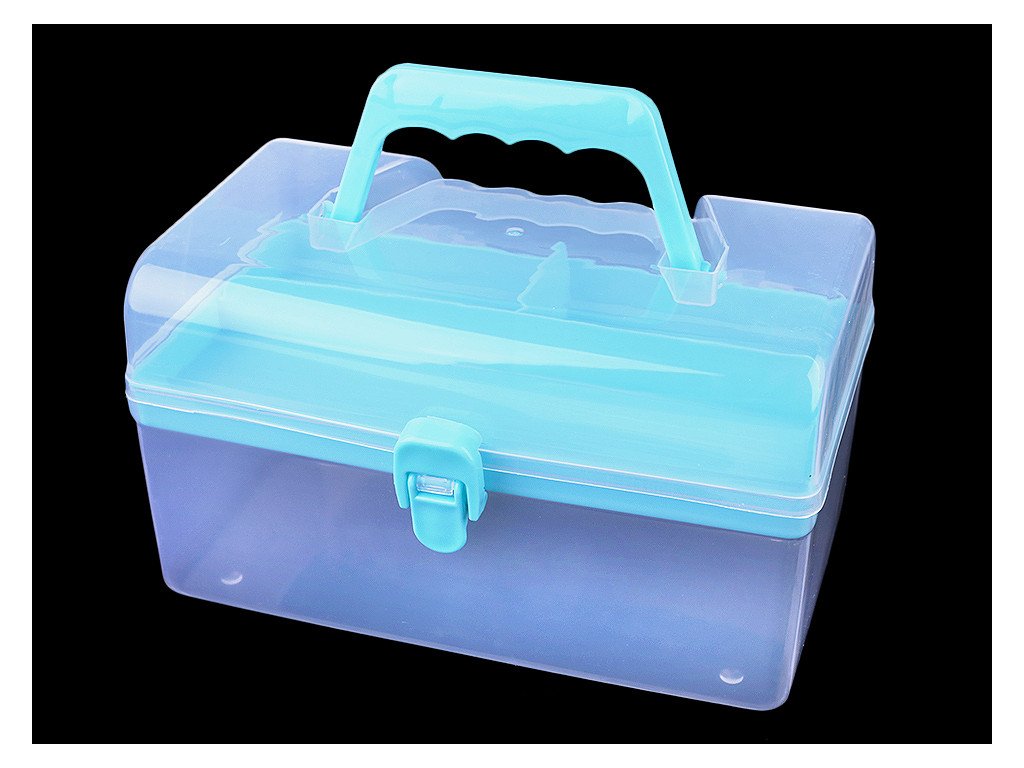 Průhledný zásobník s odnímatelným patrem je praktický pomocník při skladování komponentů a nářadí pro kreativní tvorbu. Má jednoduché pákové uzavírání a rukojeť na pohodlné přenášení. Je vhodný i pro švadleny, které ocení, že je dovnitř vidět.Odnímatelné patro na drobnosti má mělké přihrádky - jednu dlouhou a 2 malé, hluboké 1,5 - 2,5 cm. V dolním patře je prostor o rozměrech 12 x 20,5 x 6,5 cm.