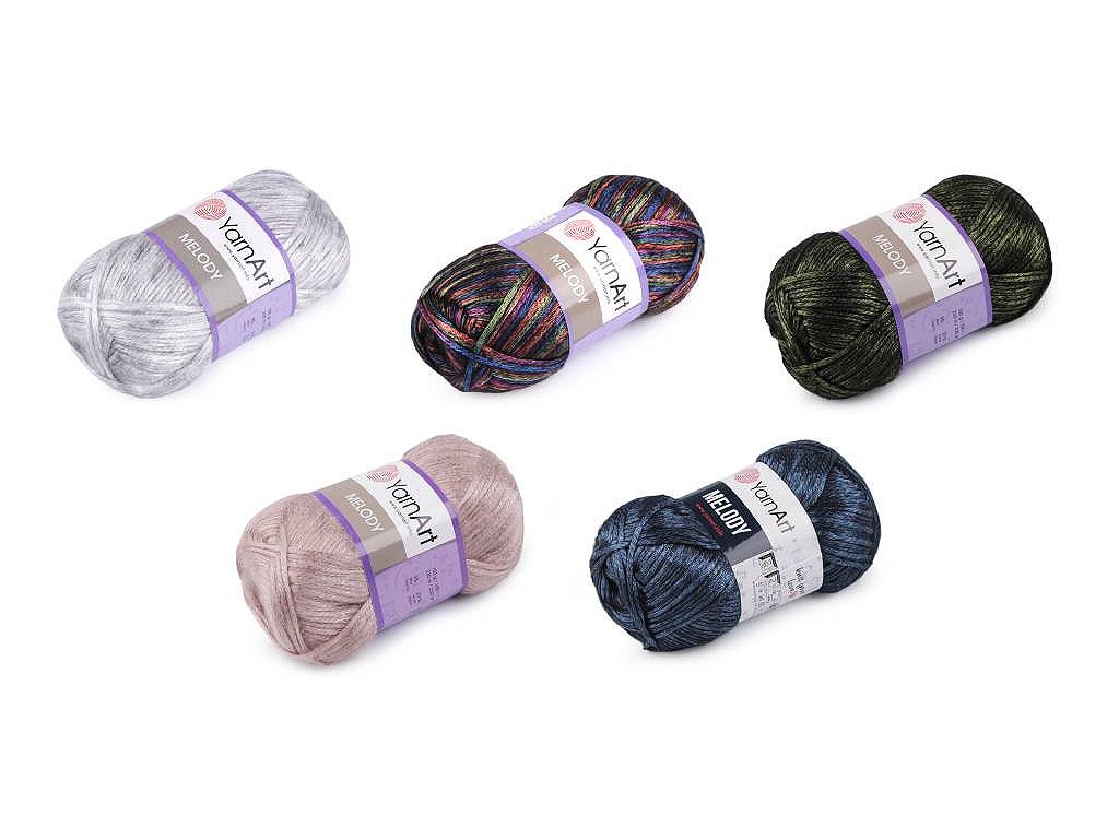 Pletací příze Melody zaujme svým jemným metalickým efektem.Použití: Přízi využijete k háčkování či pletení svetrů, čepic, vest apod.