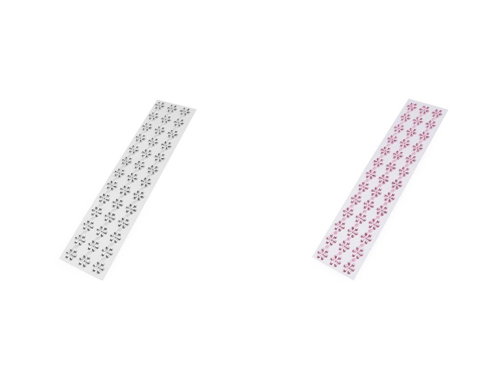 Samolepicí květy z broušených kamínků se působivě třpytí. Ocení je všichni příznivci scrapbookingu, dívky i nevěsty. Kulaté kamínky mezi květy mají 3D prolis a perlový lesk. Všechny kamínky i květy jsou nalepené na jednom archu podkladové folie, ze které se pohodlně odlepí. Jsou v řadách navzájem spojené lepicím proužkem, takže tvoří dlouhé pásky. Z pásků je ale můžete odstřihnout na jednotlivé kousky. Hodi se na ozdobení přáníčka, krabičky, květináče, deníku, fotoalba apod.Doporučujeme je lepit na suchý, hladký a pevný povrch.