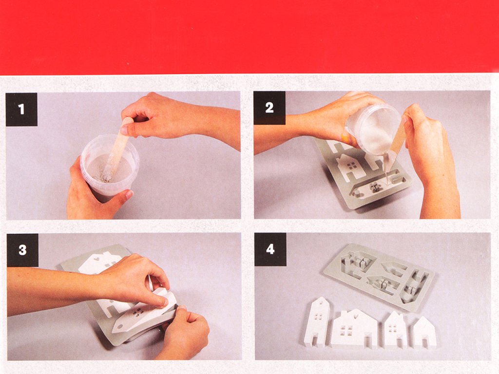 Sádrové odlitky - sádru v misce rozmíchejte s vodou podle pokynů výrobce. Rozmělněte hrudky. Sádrovou hmotu pomalu nalijte do formy, aby vám nevznikly bublinky a nechejte cca 30 min. zaschnout. Po zaschnutí vyloupněte odlitek z formy, začistěte hrany prstem nebo řezákem a nabarvěte například akrylovými barvami.