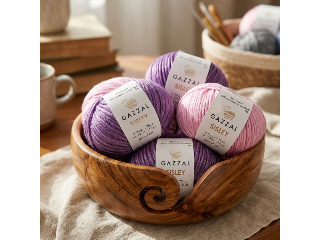 Příze Sisley je hebká, hřejivá a extrémně lesklá – ideální na svetry, čepice i šály, které potěší na dotek i pohled.