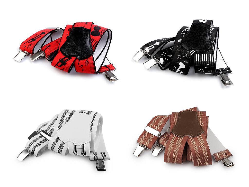 Vtipné kšandy s hudebními motivy potěší každého příznivce populární i vážné hudby. Pokud nejste milovníci pásků, „kšandy“ jsou pro vás ideálním doplňkem, který se opět vrací na výsluní.Jsou kvalitní české výroby, elastický materiál umožňuje pohodlné nošení. Zadní vsadka z eko kůže jim dodává stylový vzhled. Ke kalhotám se upevňují na tři žabky - dvě vpředu a jednu vzadu.