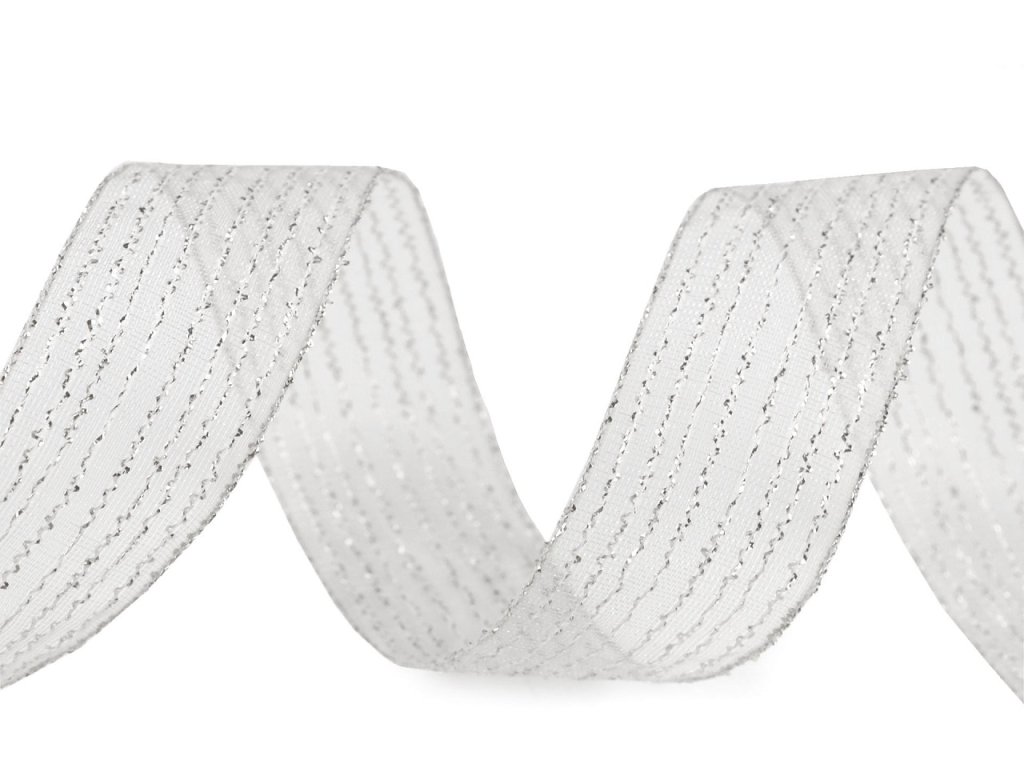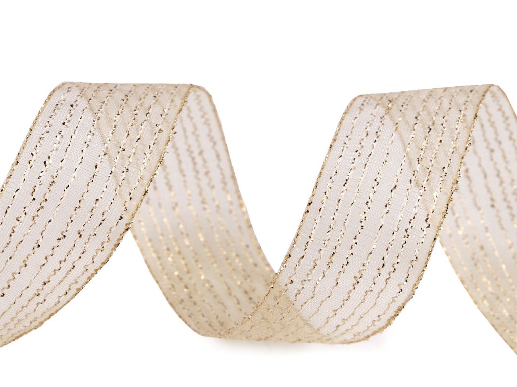 Dekorační lurexová stuha má poutavý třpyt. Je oboustranná, díky řádkování ve struktuře působí jako síťka.Použití: Stuhu můžete použít na aranžování různých ozdobných věnců a věnečků, květinových vazeb a ikeban. Je vhodná také na svatební a vánoční dekorace a balení dárků.