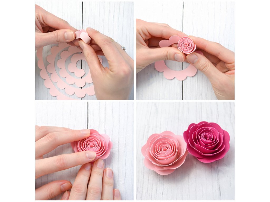Žádné otravné stříhání, jen čistá radost z tvorby! Květy se rolují z vnějšího konce k vnitřnímu. Poté stačí nanést lepidlo a přilepit plošku, která je na konci. Pak můžete květy ještě trochu rozevřít a vytvarovat. Nakonec si všechny připravte na podklad a postupně přilepte.