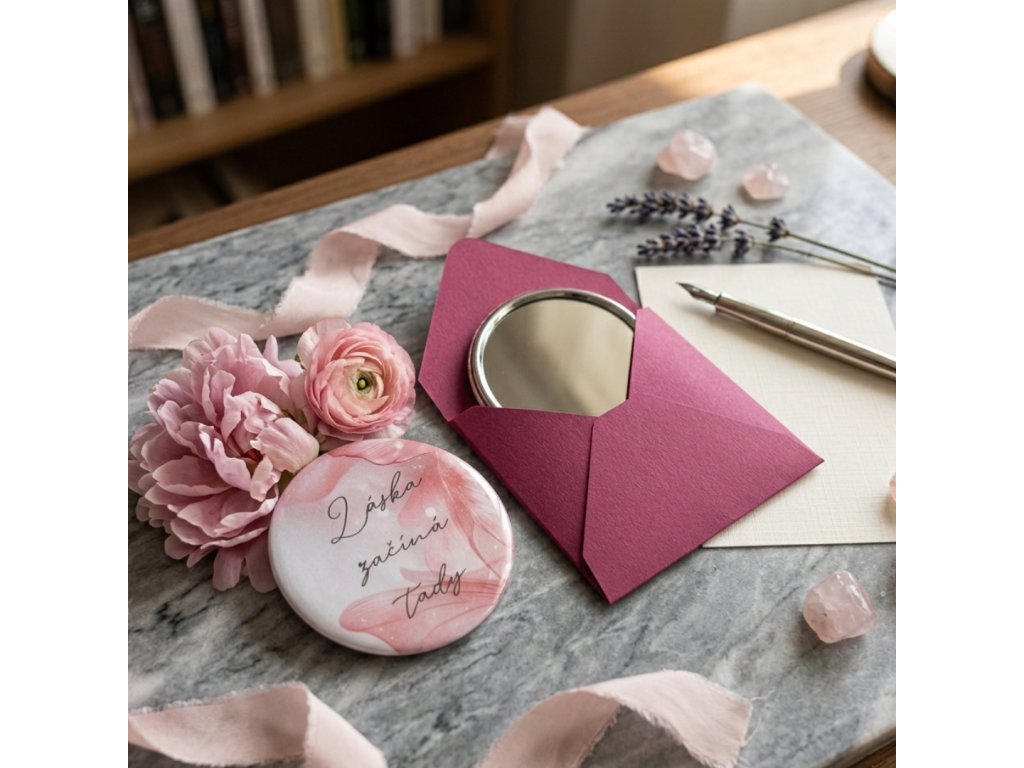 Malé. Praktické. A přitom s obrovským efektem. Kapesní zrcátko o průměru 75 mm je ideální jako milý dárek, originální merch nebo drobnost, která nese vaši značku či osobní vzkaz dál. Vytvoříme vám motiv přesně podle vašich představ – logo, ilustraci, jméno, datum svatby nebo klidně větu, která dodá odvahu při každém pohledu.
